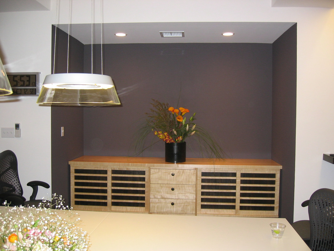This custom conference room credenza, designed and built by Kenji Hasegawa, combines functional clarity with a refined material expression. Constructed in natural figured maple with blackened steel slatted panels, the piece introduces rhythm and texture to the space. Its horizontal composition is framed by a recessed alcove painted in a deep gray tone, emphasizing the warmth of the wood and the precision of its geometry. The three central drawers provide organized storage, while the sliding doors maintain a sense of openness and balance. Set beneath recessed lighting and paired with modern pendant fixtures, the credenza serves as both a focal point and a quiet extension of the room’s architectural language.