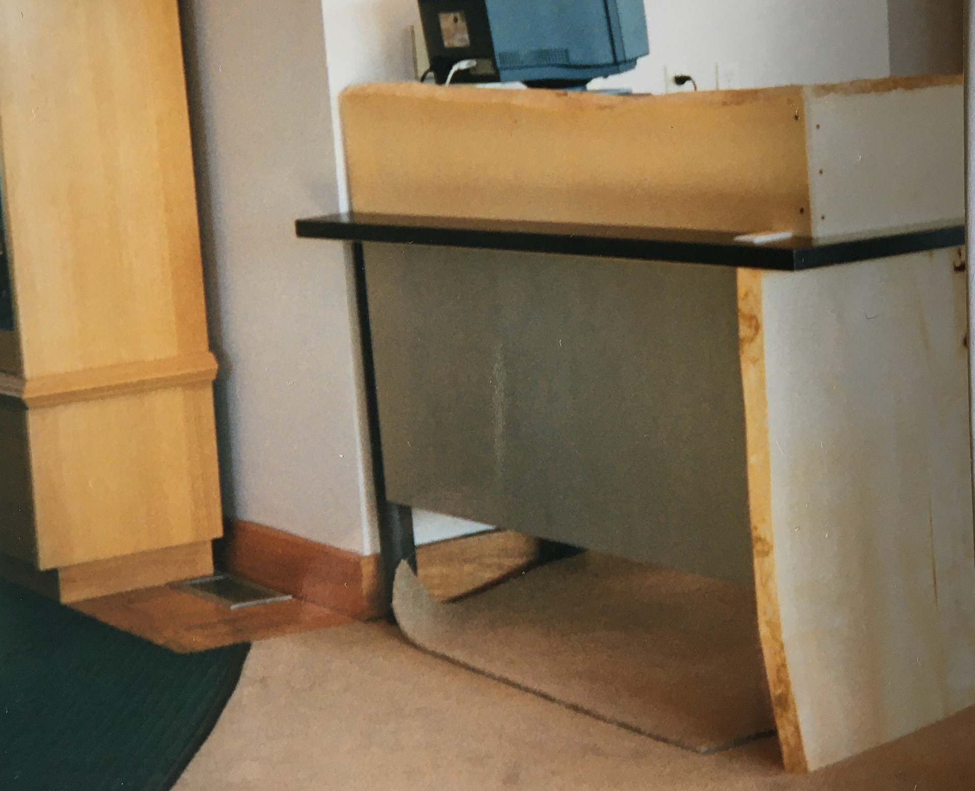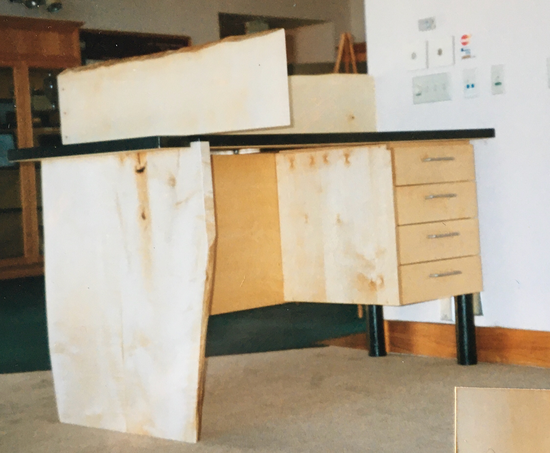Designed and built by Kenji Hasegawa, this custom secretarial desk combines solid maple slabs, blackened steel, and stainless accents in a sculptural composition that bridges craft and function. The live edge maple panels define the front, creating a natural and organic presence, while the black top provides a crisp counterpoint. On the reverse side, a brushed stainless steel panel and cylindrical legs emphasize structure and durability. The drawers are integrated seamlessly into the geometry, revealing careful joinery and balanced proportions. The piece reflects Kenji Hasegawa’s approach, merging raw material honesty with precise and modern detailing.