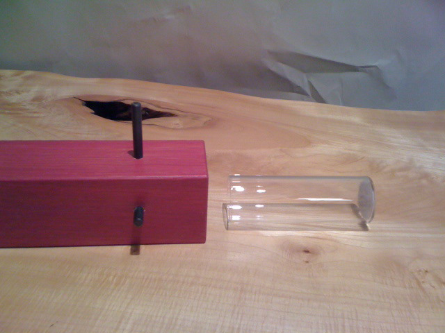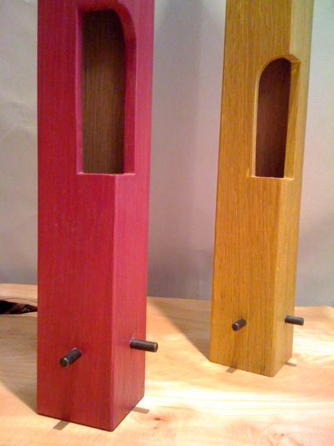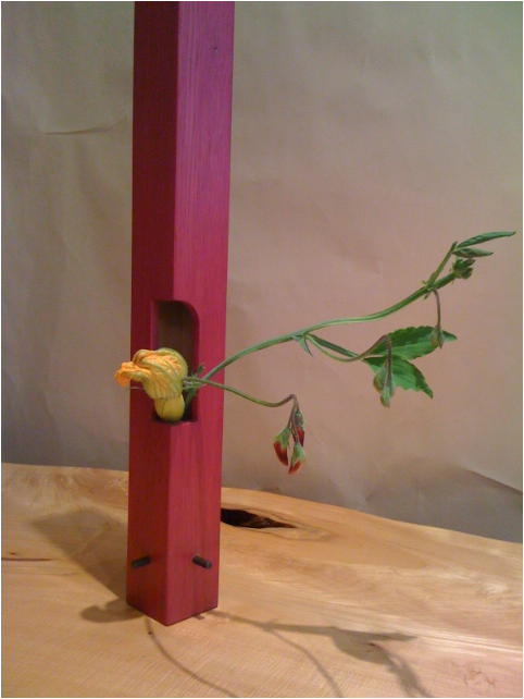 A contemporary reinterpretation of the traditional Japanese ikebana vase, Kakehana expresses the wabi-sabi values of restraint and impermanence. The piece invites contemplation of transience through its minimal form and the ephemeral life of the flower it holds. Crafted from solid wood and stained in deep crimson, the vertical body conceals a slender glass vessel supported by two dark metal pins. The cutout opening reveals the flower’s fragile stem, creating a moment of tension between the permanence of the crafted form and the fleeting beauty of nature. Designed and handcrafted by Kenji Hasegawa, the work distills simplicity, precision, and quiet presence into a single gesture.