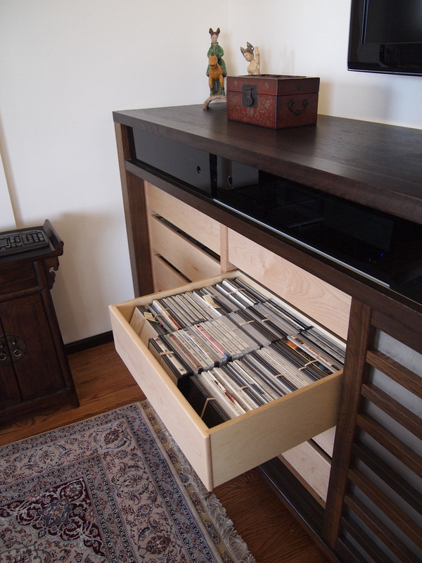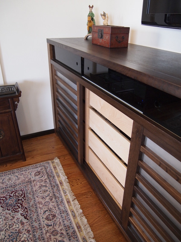 The images below show detailed views of the Media Tansu designed and built by Kenji Hasegawa, highlighting its sliding door system and custom internal storage. The dark wood frame contrasts with light maple drawers, creating a layered composition of tones and textures. The horizontal slatted sliding doors glide smoothly to reveal different storage areas behind them—concealed drawers for media collections and open shelving for electronic components. This flexible configuration allows the user to alternate between display and concealment, maintaining a clean and organized appearance. The piece seamlessly integrates functionality and precision joinery, reflecting Kenji’s thoughtful approach to modern living.