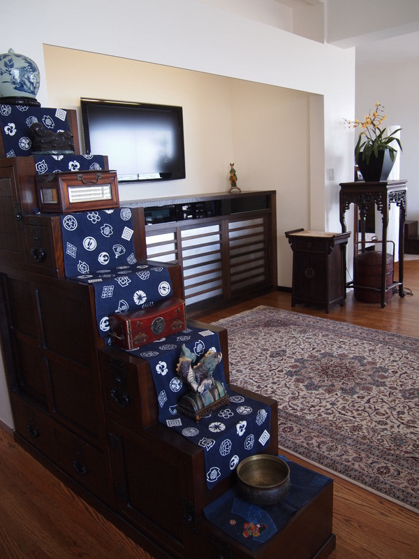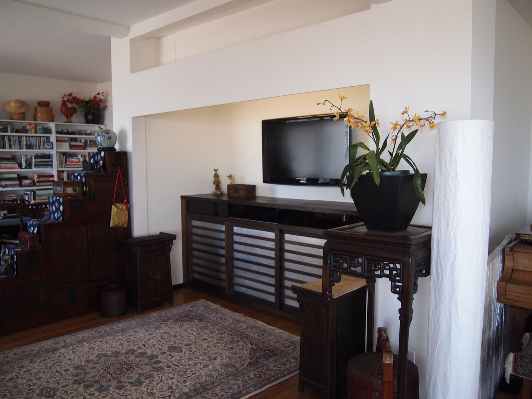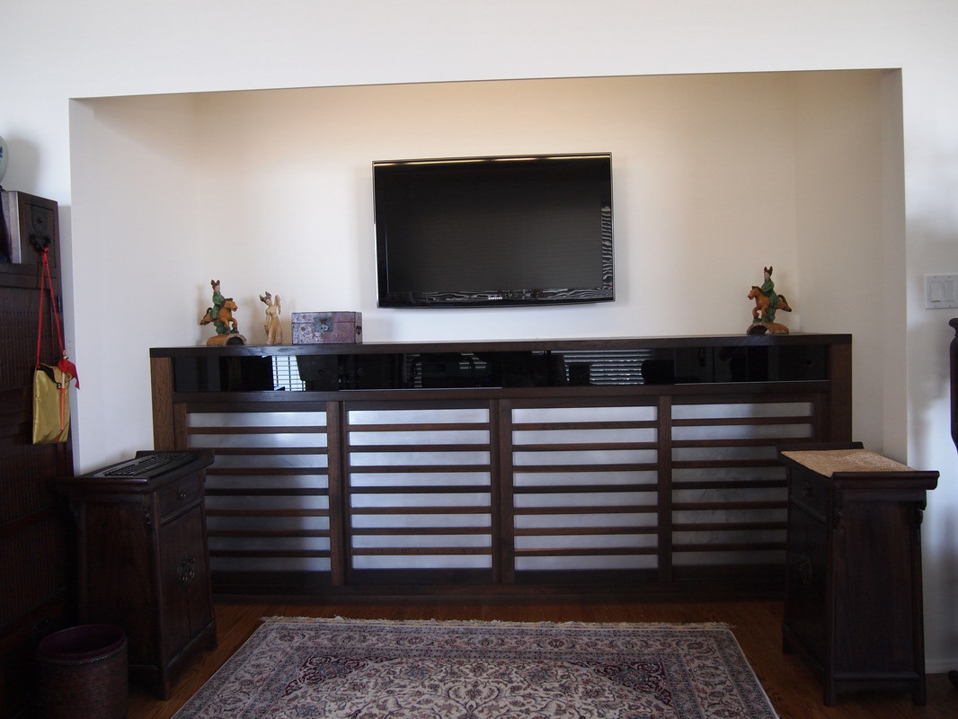 This Media Tansu, designed and built by Kenji Hasegawa, is a contemporary reinterpretation of traditional Japanese cabinetry. The piece combines dark-stained wood, brushed aluminum panels, and smoked plexiglass, creating a striking balance between opacity and reflection. Its horizontal slatted design provides rhythm and proportion while concealing modern media components behind refined detailing. The low, elongated form anchors the room and aligns seamlessly beneath a wall-mounted screen, emphasizing visual calm and order. This work exemplifies Kenji’s approach to blending modern utility with timeless craftsmanship and material harmony.